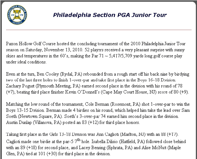 November 2010 - Congratulations to our younger customers: Ben Cooley, Zach Pogust, Cole Berman and R.J. Wren for a strong finish in the recent Paxon Hollow event.